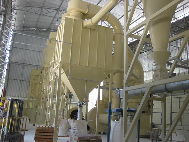 形狀較大的陶土首先由破碎設備破碎成陶土磨粉機所需粒度,斗式提升機負責將經過破碎加工的陶土送入儲料斗,之后使用振動給料機將儲料斗內的物料送進陶土磨粉機主機磨室內,經過磨輥與磨環(huán)的相互作用實現物料的破碎,粉磨完成后,經過粉磨的物料粉子在鼓風機的作用下進入選粉機,選粉機選出符合粒度要求的陶土物料,進入成品收集器內,不符合要求的陶土物料重新返回磨室內進行磨粉加工。