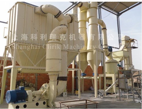該微粉磨主機(jī)電動(dòng)機(jī)通過減速器帶動(dòng)主軸及各層轉(zhuǎn)盤旋轉(zhuǎn),轉(zhuǎn)盤通過柱銷帶動(dòng)幾十個(gè)環(huán)輥在磨環(huán)滾道內(nèi)滾動(dòng)并旋轉(zhuǎn)。大塊物料經(jīng)錘式破碎機(jī)破碎成小顆粒后由提升機(jī)送入儲(chǔ)料倉(cāng),電磁振動(dòng)給料機(jī)將物料均勻的送到上轉(zhuǎn)盤的中部,物料在離心力的作用下散向圓周邊,并落入磨環(huán)的滾道內(nèi)被環(huán)滾沖壓、滾碾、研磨而粉碎,物料經(jīng)層粉碎后又落入第二層及第三層,高壓離心風(fēng)機(jī)的抽吸作用將外部空氣吸入機(jī)內(nèi),并將經(jīng)過第三層粉碎后的粗粉帶入選粉機(jī)內(nèi)。選粉機(jī)內(nèi)旋轉(zhuǎn)的渦輪所產(chǎn)生的渦流使粗顆粒物料回落重磨,細(xì)粉則隨氣流進(jìn)入旋風(fēng)集粉器并由其下部的卸料閥排出即為成品,而帶有少量細(xì)粉塵的氣流則經(jīng)過脈沖除塵器凈化后通過風(fēng)機(jī)及消聲器排出。
