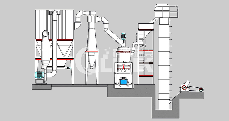我們把方解石大塊物料經(jīng)破碎機(jī)破碎到能進(jìn)入磨粉機(jī)的入料細(xì)度(15mm-50mm),經(jīng)過破碎后的方解石小塊物料經(jīng)提升機(jī)送至料倉,再經(jīng)振動(dòng)給料機(jī)將其均勻定量的送入磨機(jī)研磨室內(nèi)進(jìn)行研磨。